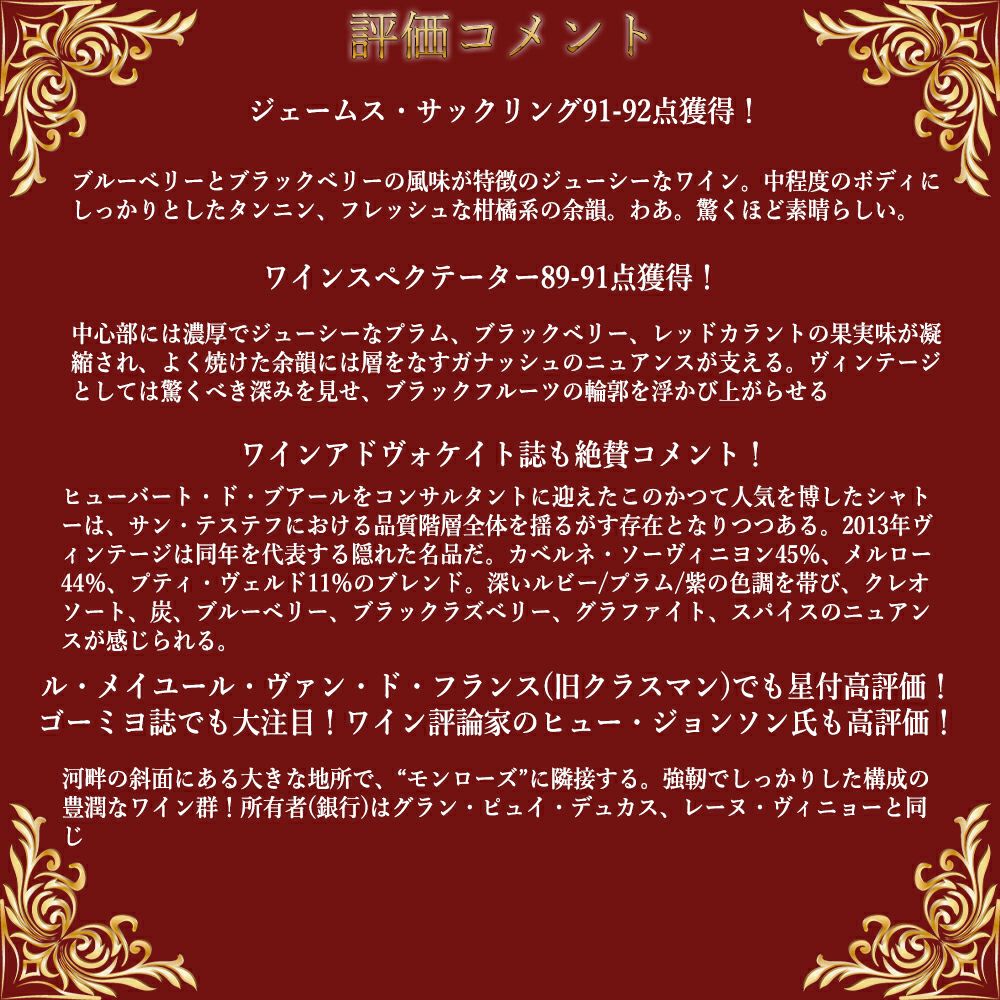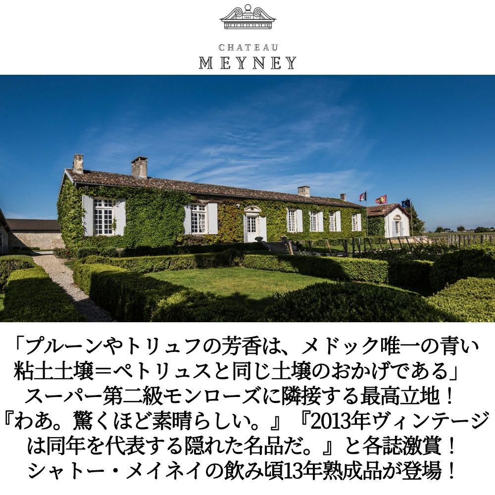 他の画像を見る シャトー メイネイ 2013 AOCサン テステフ 飲み頃13年熟成作品 ジェームス サックリング91-92点&ワインスペクテーター89-91点Chateau MEYNEY 2013 AOC Saint-Estephe 赤ワイン フランス フルボディ 辛口 当店特別価格 ¥ 3,971 税込 在庫切れ 詳細を見る お気に入りに登録する