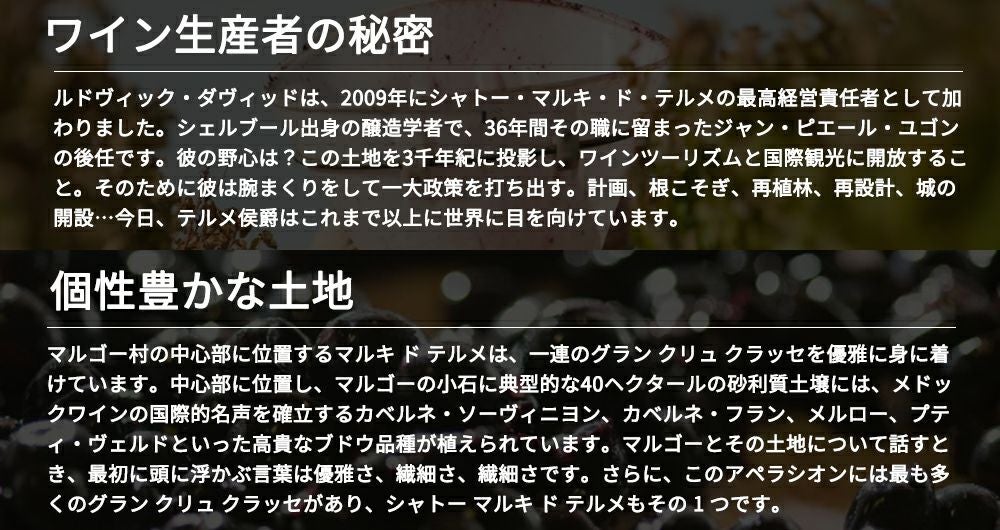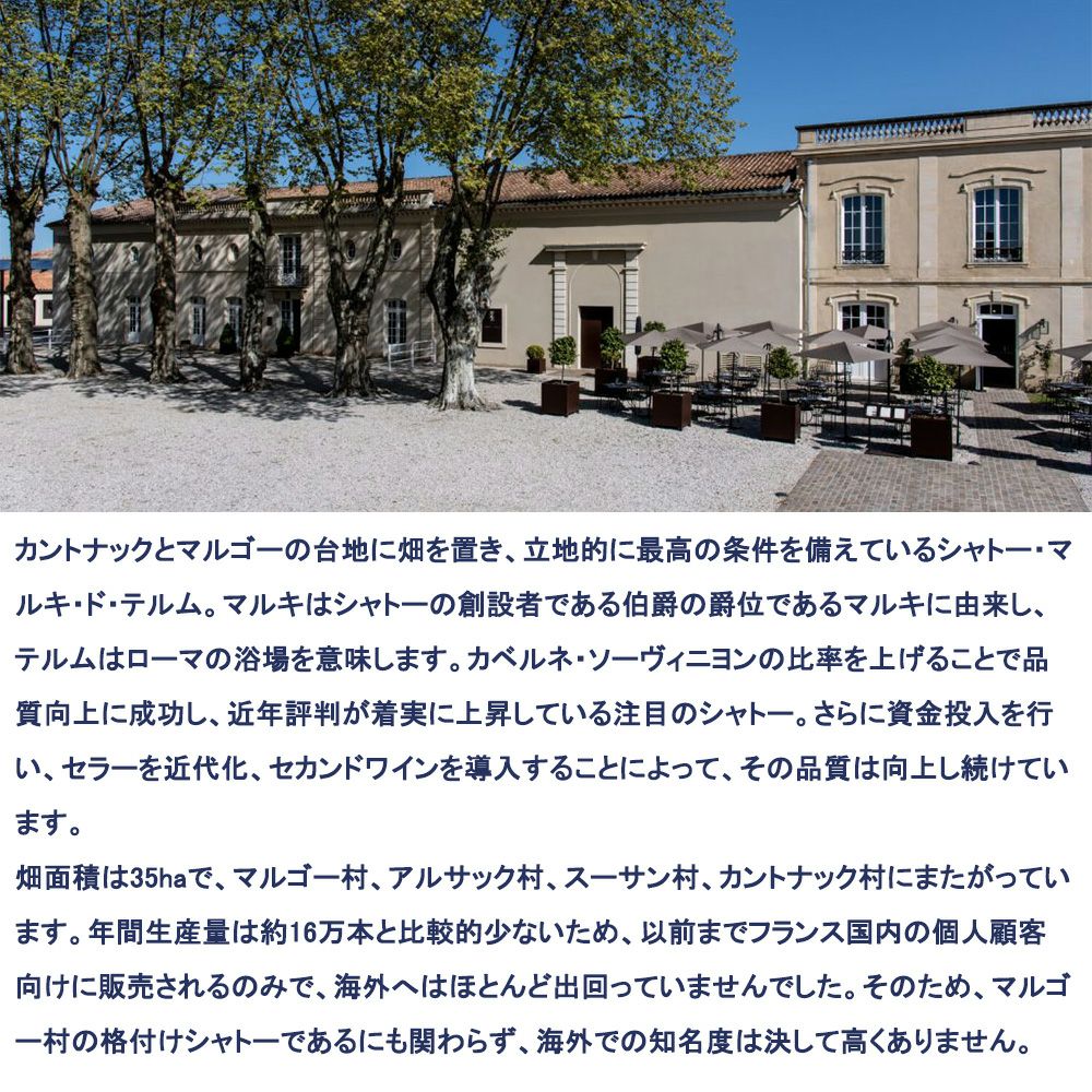 他の画像を見る シャトー マルキ ド テルム 2014 メドック グラン クリュ クラッセ 格付第4級 JS驚異の93点&WA誌驚異の90点 明治屋輸入品Chateau Marquis de Terme 2014 AOC Margaux Grand Cru 赤ワイン フランス フルボディ 辛口 当店特別価格 ¥ 6,345 税込 在庫切れ 詳細を見る お気に入りに登録する