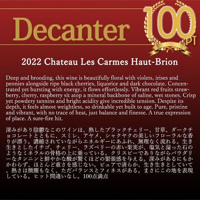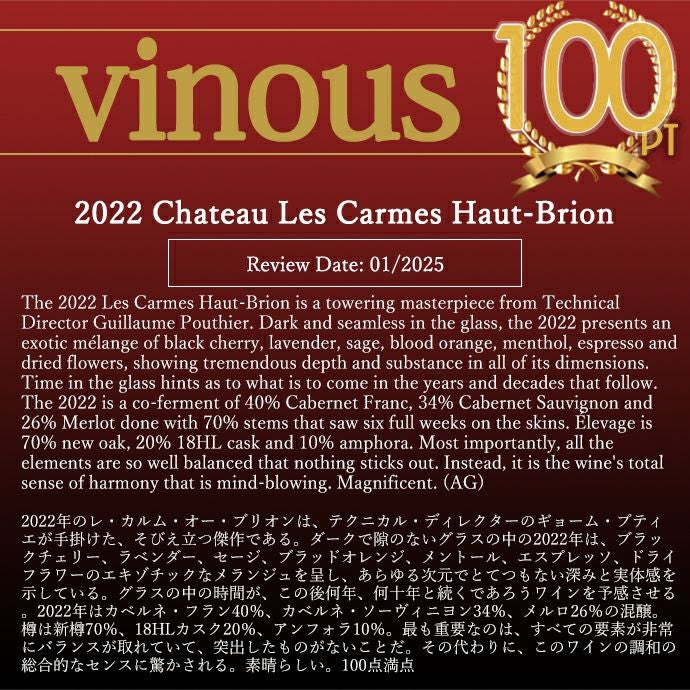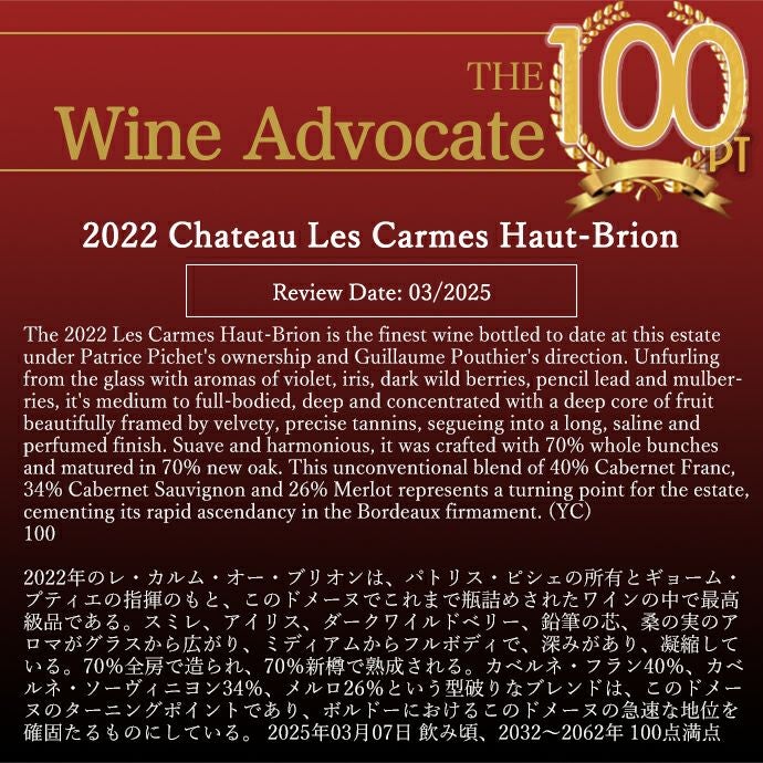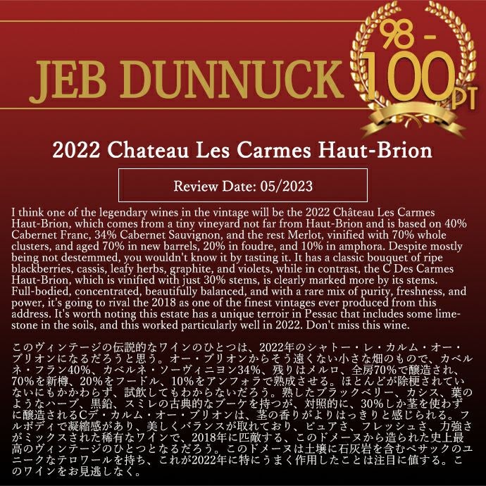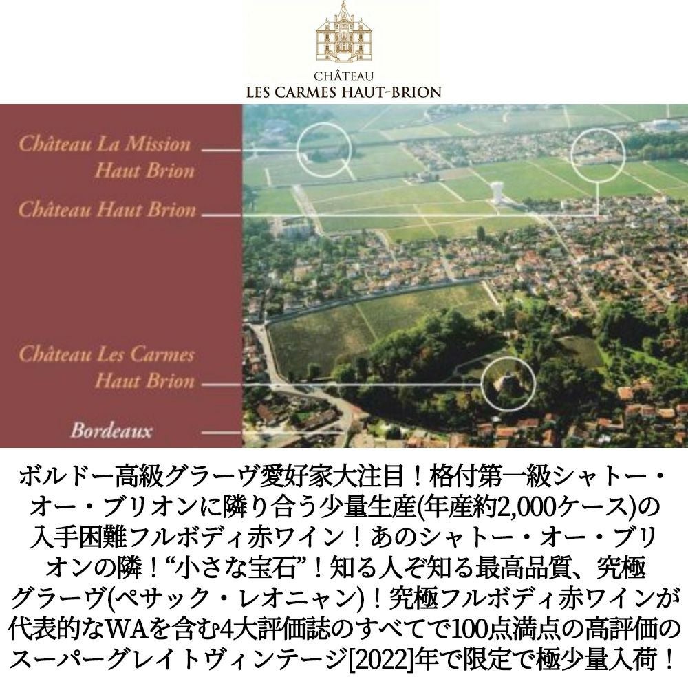 他の画像を見る シャトー レ カルム オー ブリオン 2022 AOCペサック レオニャン シャトー元詰 ヴィノス誌驚異の100点満点&WA誌驚異の100点満点Chateau Les Carmes Haut-Brion 2022 AOC 赤ワイン フランス フルボディ 辛口 当店特別価格 ¥ 37,411 税込 在庫切れ 詳細を見る お気に入りに登録する