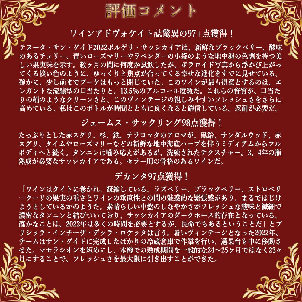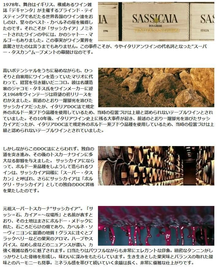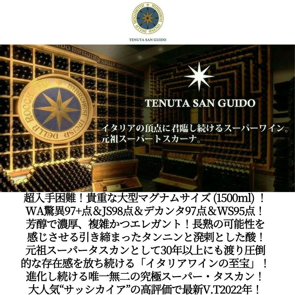 他の画像を見る 【大型マグナム 木箱】サッシカイア 2022 テヌータ サン グイド 正規代理店輸入品 DOCボルゲリ スペリオーレ WA誌驚異の97+点&JS98点SASSICAIA 2022 Tenuta San Guido (Incisa della 赤ワイン イタリア フルボディ 辛口 当店特別価格 ¥ 72,941 税込 在庫切れ 詳細を見る お気に入りに登録する