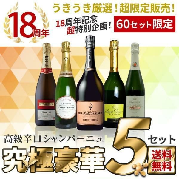 他の画像を見る 【送料無料】60セット限定 18周年記念超特別企画 うきうき厳選 超限定販売 高級辛口シャンパーニュ究極豪華5本セット シャンパン ワインセット スパークリングワインUkiuki Special Champagne set シャンパン フランス 辛口 送料無料 当店特別価格 ¥ 20,691 税込 在庫切れ 詳細を見る お気に入りに登録する
