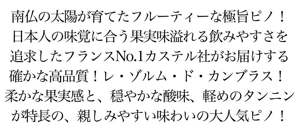 他の画像を見る レ ゾルム ド カンブラス ピノ ノワール キュヴェ レセルヴ 2024 ラベルにロットナンバー入り IGTペイ ドック 赤ワインLes Ormes de CAMBRAS Pinot Noir Cuvee Reserve 2024 TGP Pays D'OC 赤ワイン フランス ミディアムボディ 辛口 当店特別価格 ¥ 950 税込 カートに入れる お気に入りに登録する