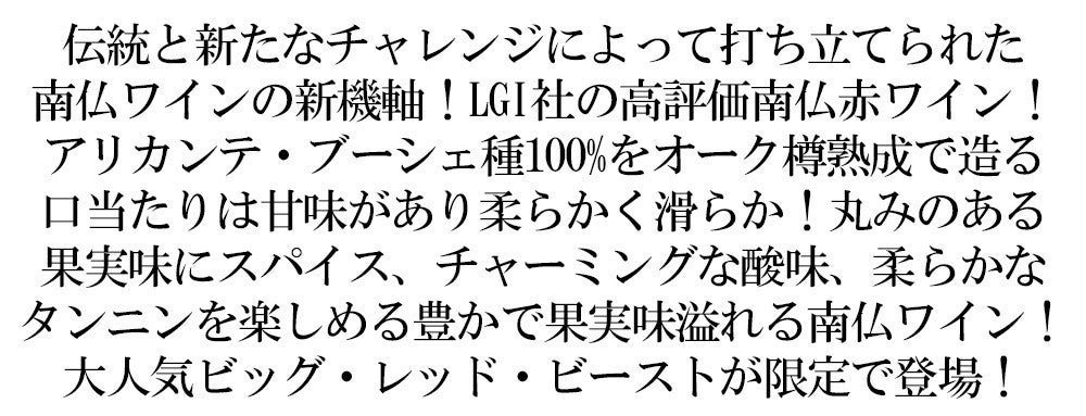 他の画像を見る ビッグ レッド ビースト 2024 アリカンテ ブーシェ種100% エル ジー アイ社 IGPペイBIG RED BEAST 2024 LGI 【eu_ff】 赤ワイン フランス フルボディ 辛口 当店特別価格 ¥ 1,199 税込 カートに入れる お気に入りに登録する