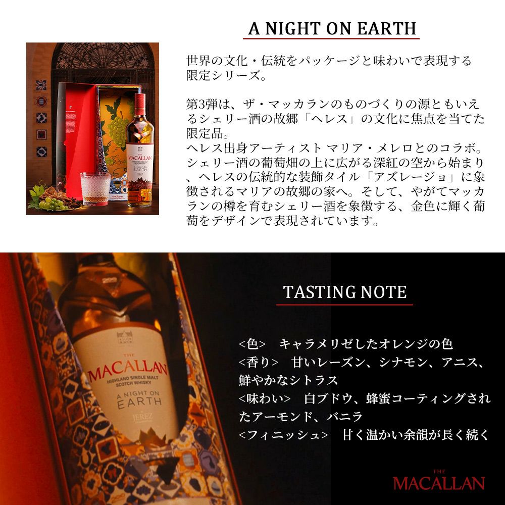 他の画像を見る 【正規品 箱入】ザ マッカラン ア ナイト オン アース イン ヘレス ハイランド シングル モルト スコッチ ウイスキー700ml 43%THE MACALLAN A NIGHT ON EARTH IN JEREZ ウイスキー 当店特別価格 ¥ 17,660 税込 カートに入れる お気に入りに登録する