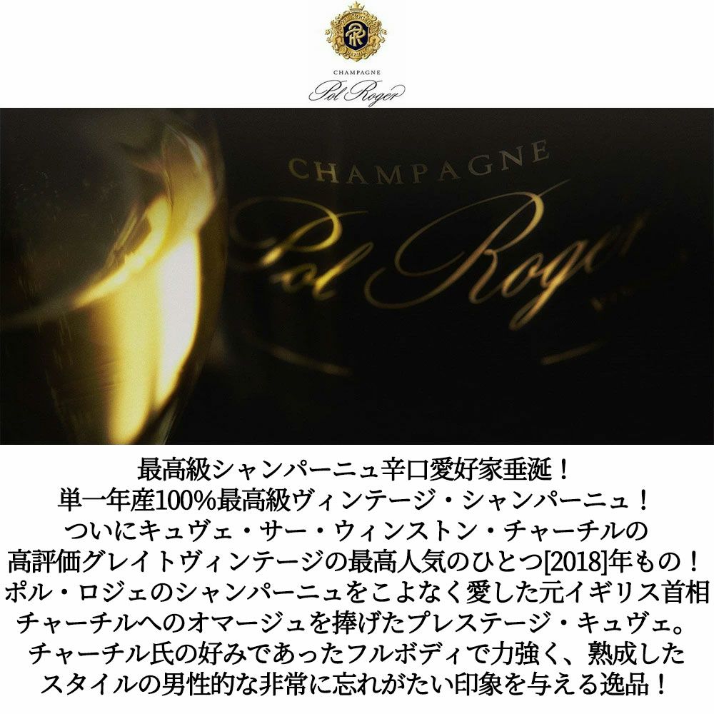 他の画像を見る 【豪華ギフト箱入】ポル ロジェ キュヴェ サー ウィンストン チャーチル ミレジメ 2018 年 正規代理店輸入品 Pol Roger Champagne Sir Winston Churchill Millesime 2018 スパークリング シャンパン フランス 辛口 当店特別価格 ¥ 39,312 税込 カートに入れる お気に入りに登録する
