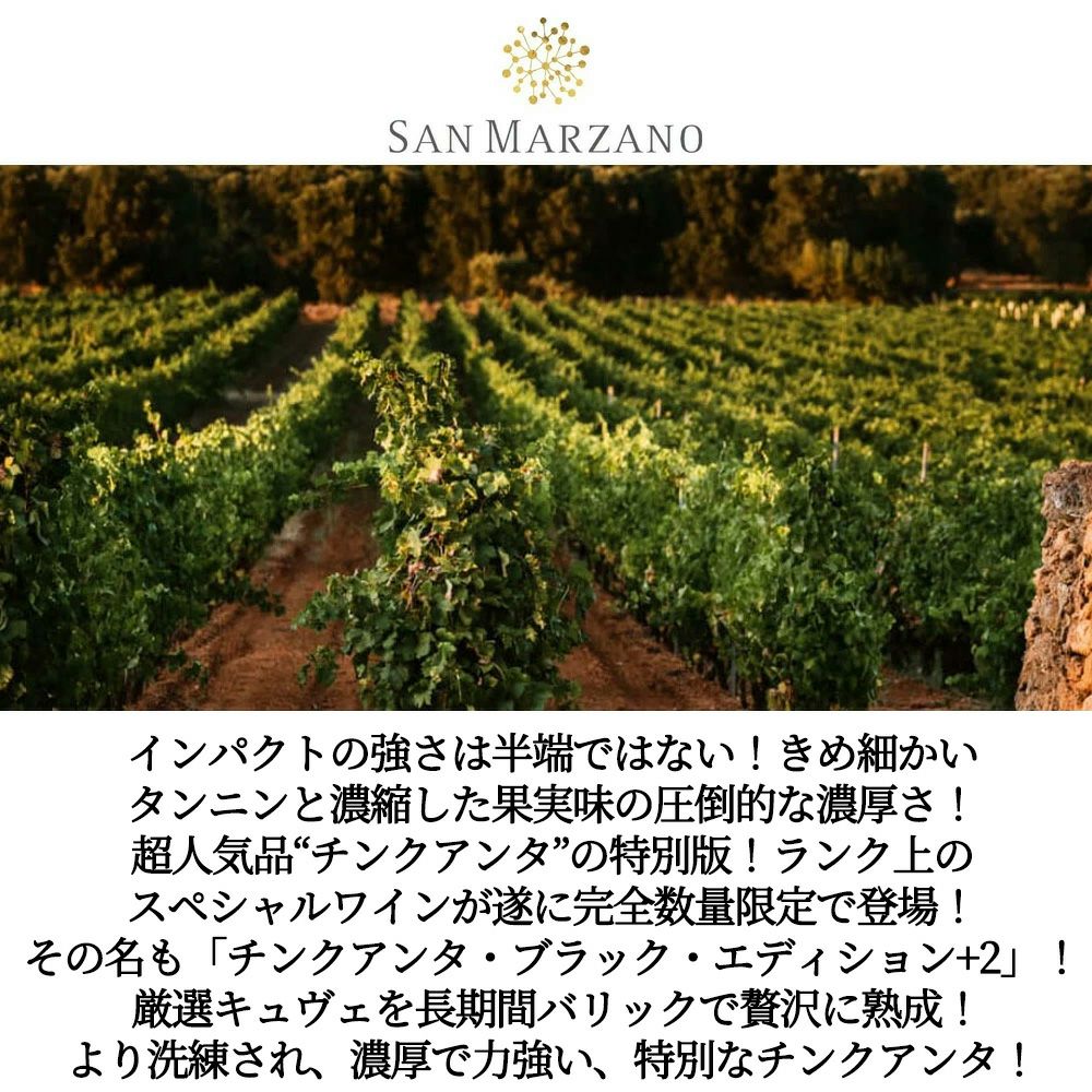 他の画像を見る コレッツィオーネ チンクアンタ ブラック エディション+2 N.V カンティーネ サン マルツァーノ 重厚ボトル (イタリア プーリア サレント) Collezione 50 Black Edition +2 San Marzano 赤ワイン イタリア フルボディ 辛口 当店特別価格 ¥ 3,333 税込 カートに入れる お気に入りに登録する