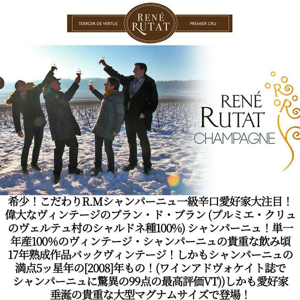 他の画像を見る 【大型ボトル】ルネ リュタ シャンパーニュ プルミエ クリュ 一級 ブラン ド ブラン ブリュット ミレジム 2008 蔵出し限定作品 ルネ リュタ家Rene Rutat Champagne 1er Cru Blanc de Blancs 白ワイン シャンパン フランス 辛口 当店特別価格 ¥ 21,945 税込 在庫切れ 詳細を見る お気に入りに登録する