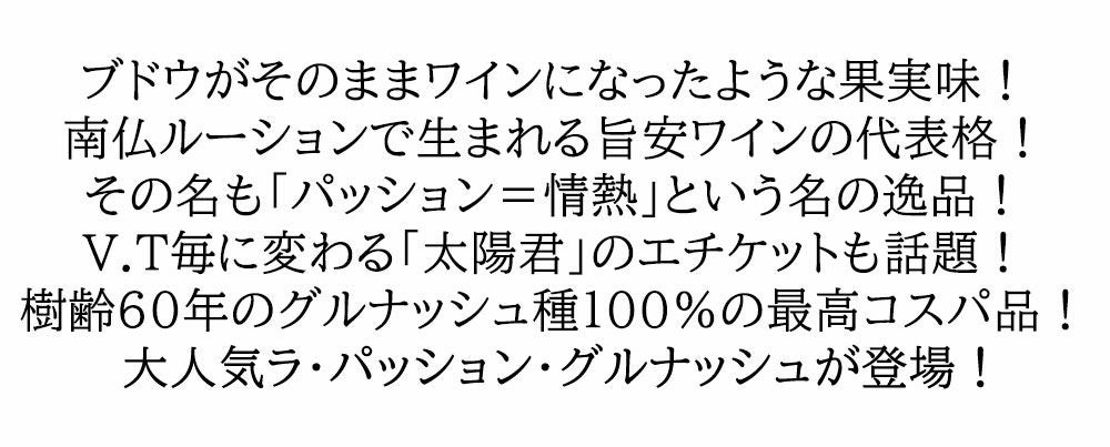 他の画像を見る ラ パッション グルナッシュ 2024 ジャン プラ セレクション グルナッシュ種100% IGPコート カタランヌ 南仏 赤ワイン フランスワインLa Passion Grenache 2024 IGP Cotes Catalanes 赤ワイン フランス ミディアムボディ 辛口 当店特別価格 ¥ 1,588 税込 カートに入れる お気に入りに登録する