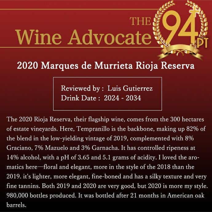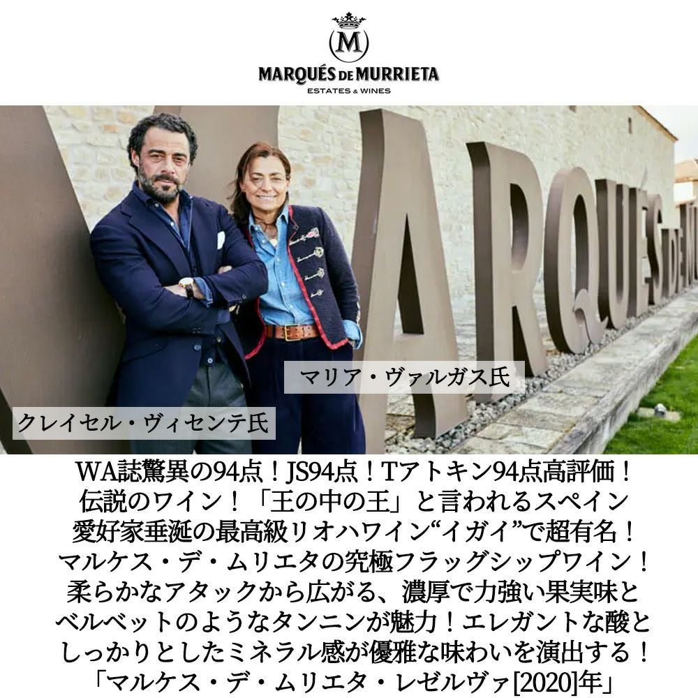 他の画像を見る マルケス デ ムリエタ レゼルヴァ 2020 蔵出し品 ワインアドヴォケイト誌驚異の94+点&JS94点&ティム アトキン94点高評価Marques de Murrieta Reserva 2020 Spain Rioja 赤ワイン スペイン フルボディ 辛口 当店特別価格 ¥ 3,291 税込 カートに入れる お気に入りに登録する