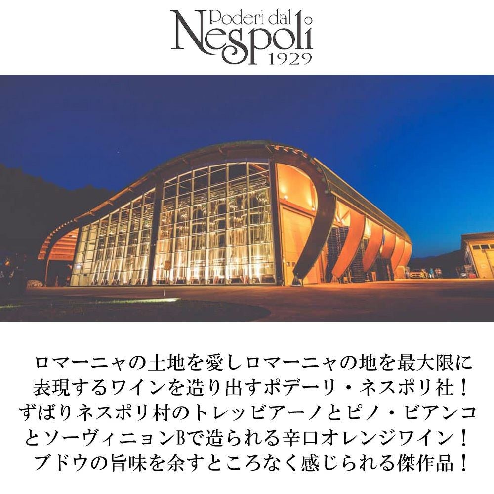 他の画像を見る ポデーリ ダル ネスポリ オレンジ ワイン 2024 数量限定輸入品 ポデーリ ダル ネスポリ社 IGTルビコーネ ビアンコ'Orange Wine Rubicone 2024 PODERI DAL NESPOLI 白ワイン オレンジ イタリア 辛口 当店特別価格 ¥ 2,069 税込 カートに入れる お気に入りに登録する