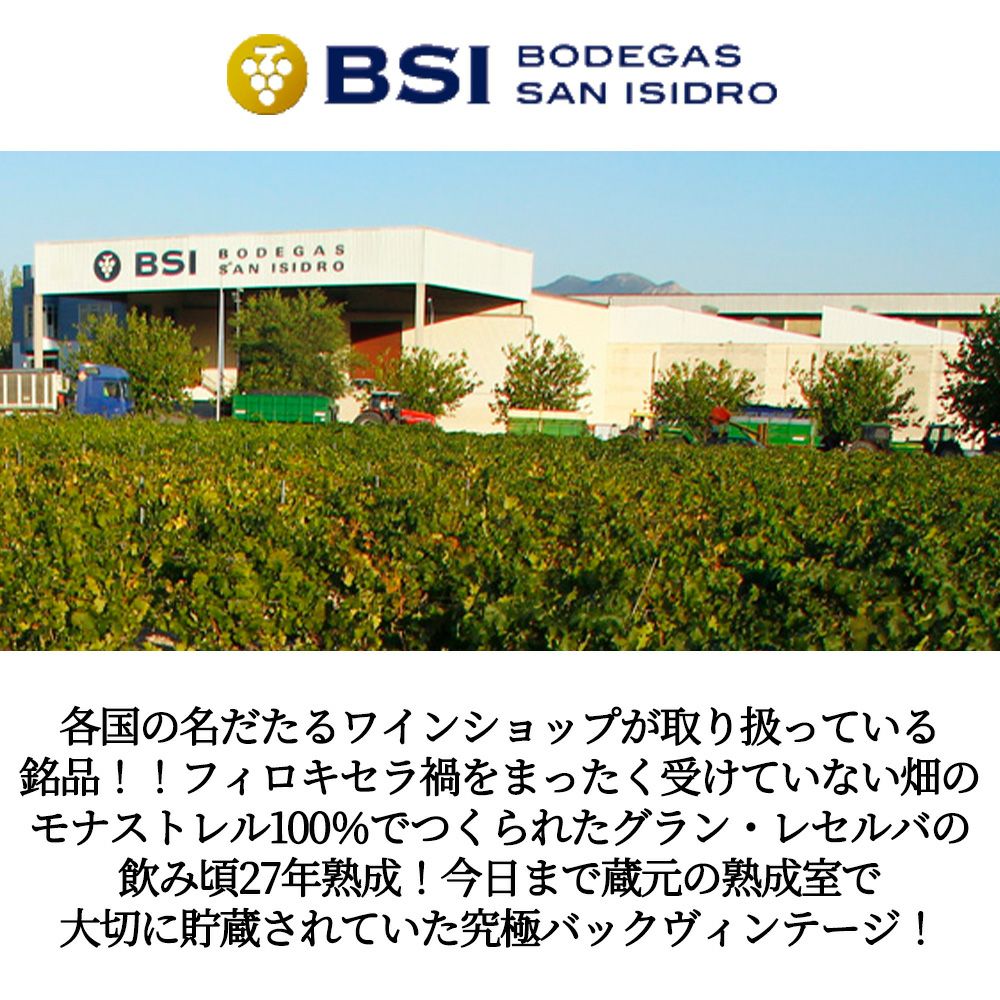 他の画像を見る ボデガス サン イシドロ グラン レセルバ 1998 蔵出し限定古酒 D.O.フミージャ 正規品San Isidro Gran Reserva 1998 D.O. Jumilla Bodegas San Isidro 赤ワイン スペイン フルボディ 辛口 当店特別価格 ¥ 6,520 税込 カートに入れる お気に入りに登録する