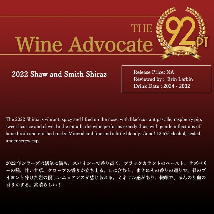 他の画像を見る ショウ&(アンド)スミス シラーズ 2022 アデレード ヒルズ産シラーズ100% オーナー マーティン ショウ&マイケル ヒル スミス ジェームス サックリング驚異の95点Shaw & Smith Syrah 2022 赤ワイン オーストラリア フルボディ 辛口 当店特別価格 ¥ 4,064 税込 カートに入れる お気に入りに登録する