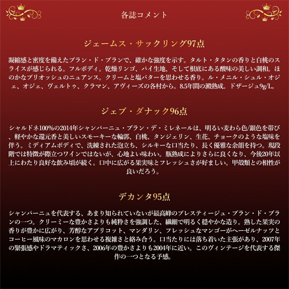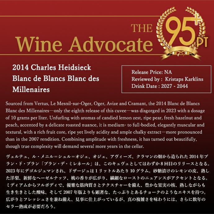 他の画像を見る シャルル エドシック シャンパーニュ ブラン デ ミレネール ミレジム 2014 ブラン ド ブラン 正規品 ワインエンスージアスト誌驚異の98点Charles Heidsieck Champagne Blanc des Millenaires 白ワイン スパークリング シャンパン フランス 辛口 当店特別価格 ¥ 45,980 税込 カートに入れる お気に入りに登録する