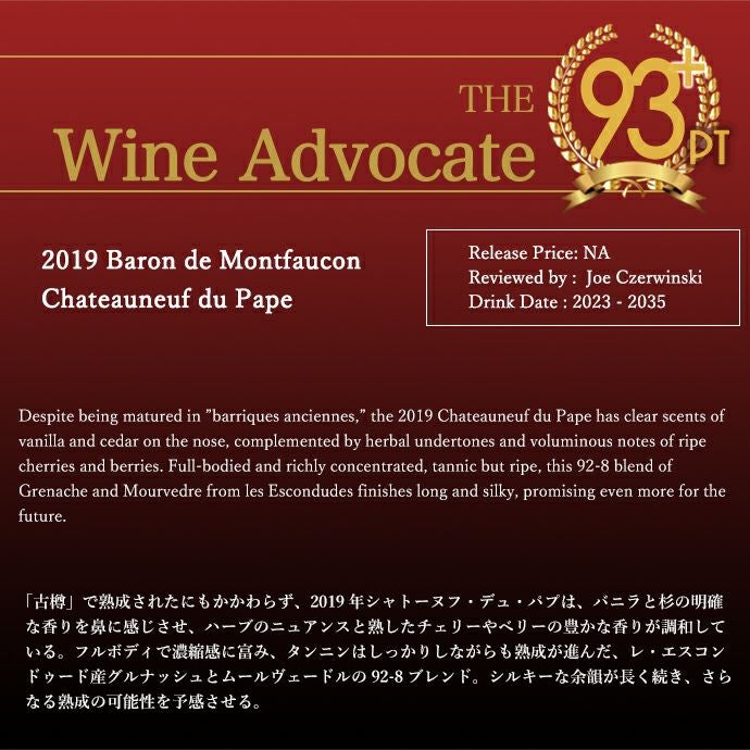 他の画像を見る シャトーヌフ デュ パプ 2019 バロン ド モンフォーコン(シャトー ド モンフォーコン)(当主ロドルフ ドゥ パンス家)Chateauneuf du Pape 2019 Baron de Monfaucon 赤ワイン フランス フルボディ 辛口 当店特別価格 ¥ 4,786 税込 カートに入れる お気に入りに登録する