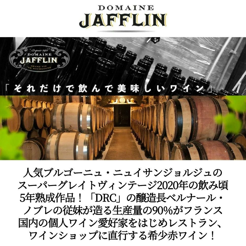 他の画像を見る ニュイ サン ジョルジュ 2020 ドメーヌ ジャフラン元詰 蔵出し限定作品 平均樹齢35年のピノ ノワール&オーク樽18ヶ月間熟成 14.5%Nuits Saint Georges 2020 Domaine Jafflin 赤ワイン フランス フルボディ 辛口 当店特別価格 ¥ 8,025 税込 カートに入れる お気に入りに登録する