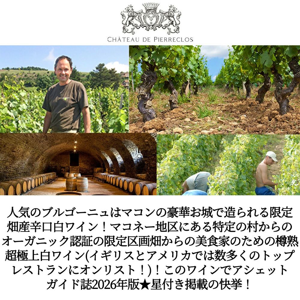 他の画像を見る マコン ピエールクロ ブラン 2023 蔵出し限定作品 シャトー ド ピエールクロ元詰 AOC 重厚ボトル 自然派 有機オーガニック ビオロジックMacon Pierreclos Blanc 2023 Chateau de Pierreclos 白ワイン フランス 辛口 当店特別価格 ¥ 4,598 税込 カートに入れる お気に入りに登録する
