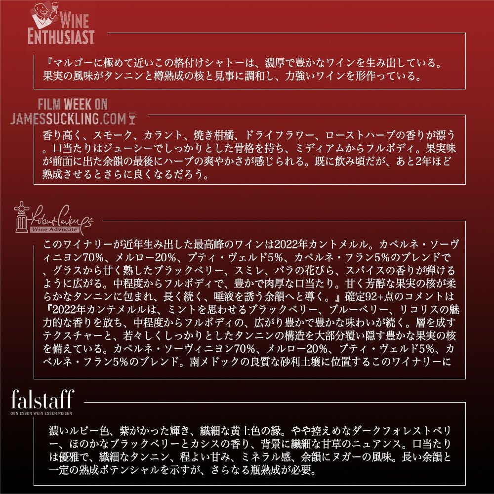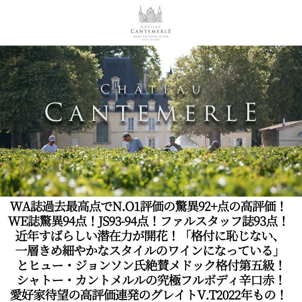他の画像を見る シャトー カントメルル 2022 メドック グラン クリュ クラッセ メドック格付第五級 AOCオー メドックChateau CANTEMERLE 2022 Grand Cru Classe du Medoc en 1855 (Classification. 5eme Cru Classe.) 赤ワイン フランス フルボディ 辛口 当店特別価格 ¥ 5,222 税込 カートに入れる お気に入りに登録する