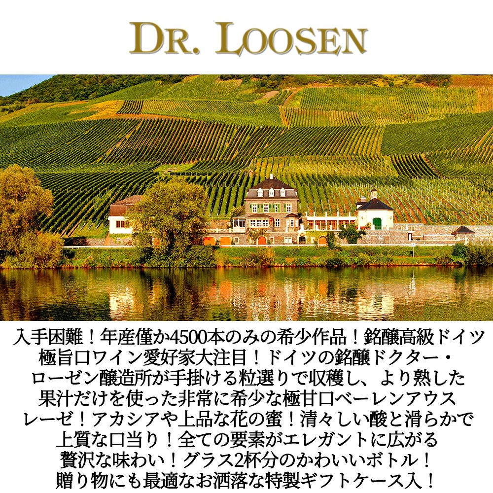 他の画像を見る 【箱入】ドクター ローゼン リースリング ベーレンアウスレーゼ 2018 超限定品 ヴァイングート ドクター ローゼン家元詰Dr. Loosen Riesling Beerenauslese 2018 Weingut Dr. Loosen 白ワイン ドイツ 極甘口 当店特別価格 ¥ 3,114 税込 カートに入れる お気に入りに登録する