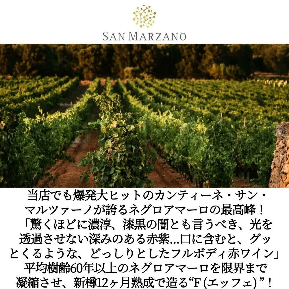 他の画像を見る エッフェ 2021 蔵出し品 カンティーネ サン マルツァーノ社元詰 重厚ボトル ネグロアマーロ種100% オーク樽12ヶ月熟成 度数14.5%F 2021 San Marzano vini S.p.A. 赤ワイン イタリア フルボディ 辛口 当店特別価格 ¥ 4,159 税込 カートに入れる お気に入りに登録する