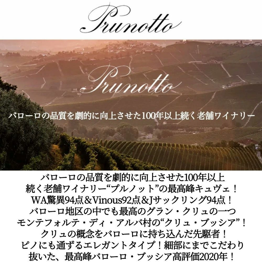 他の画像を見る バローロ ブッシア 2020 プルノット (アンティノリ) DOCGバローロ WA誌驚異の94点&ヴィノス誌94点&JS94点 正規代理店輸入品Barolo Bussia 2020 Prunotto DOCG Barolo 赤ワイン イタリア フルボディ 辛口 当店特別価格 ¥ 10,638 税込 カートに入れる お気に入りに登録する