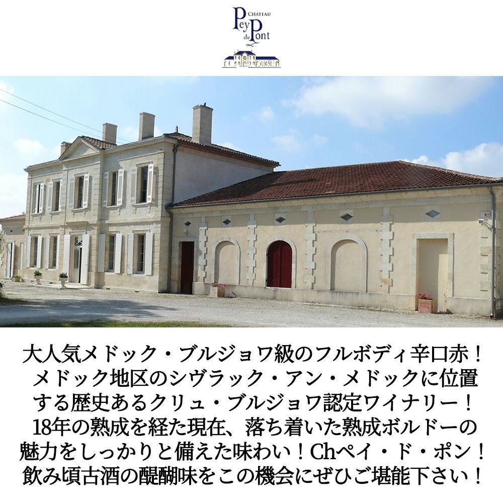 他の画像を見る シャトー ペイ ド ポン 2008 AOCメドック クリュ ブルジョワ 飲み頃18年熟成古酒Chateau Pey de Pont 2008 AOC Medoc Cru Bourgeois 赤ワイン フランス フルボディ 辛口 当店特別価格 ¥ 2,424 税込 カートに入れる お気に入りに登録する
