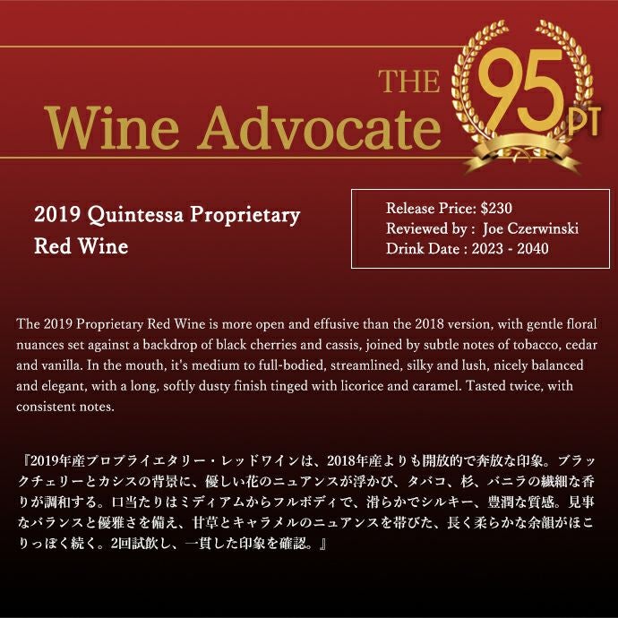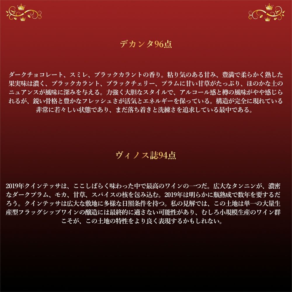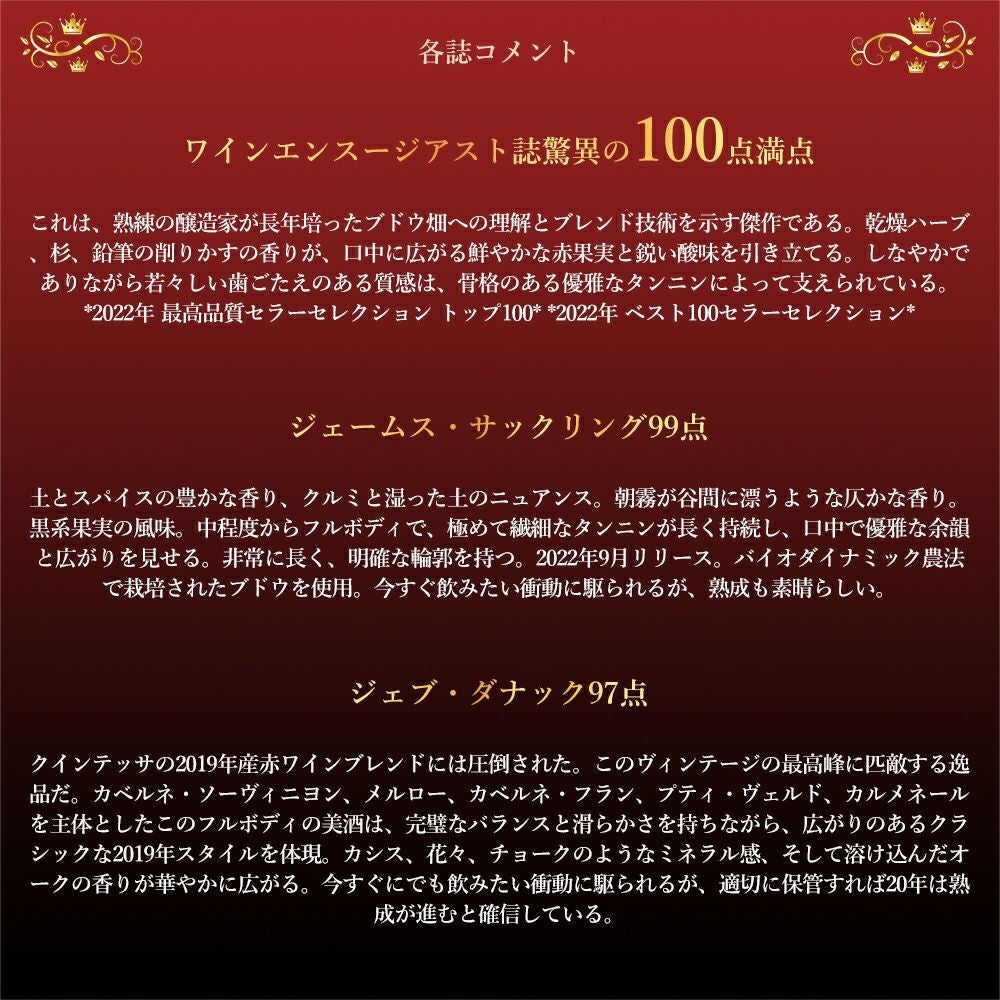 他の画像を見る クィンテッサ 2019 クィンテッサ(ヒューネウス家) カリフォルニア ナパヴァレー ラザフォード ワインエンスージアスト誌驚異の100点満点QUINTESSA 2019 RUTHERFORD Napa Valley CA 赤ワイン フランス フルボディ 辛口 当店特別価格 ¥ 38,456 税込 カートに入れる お気に入りに登録する