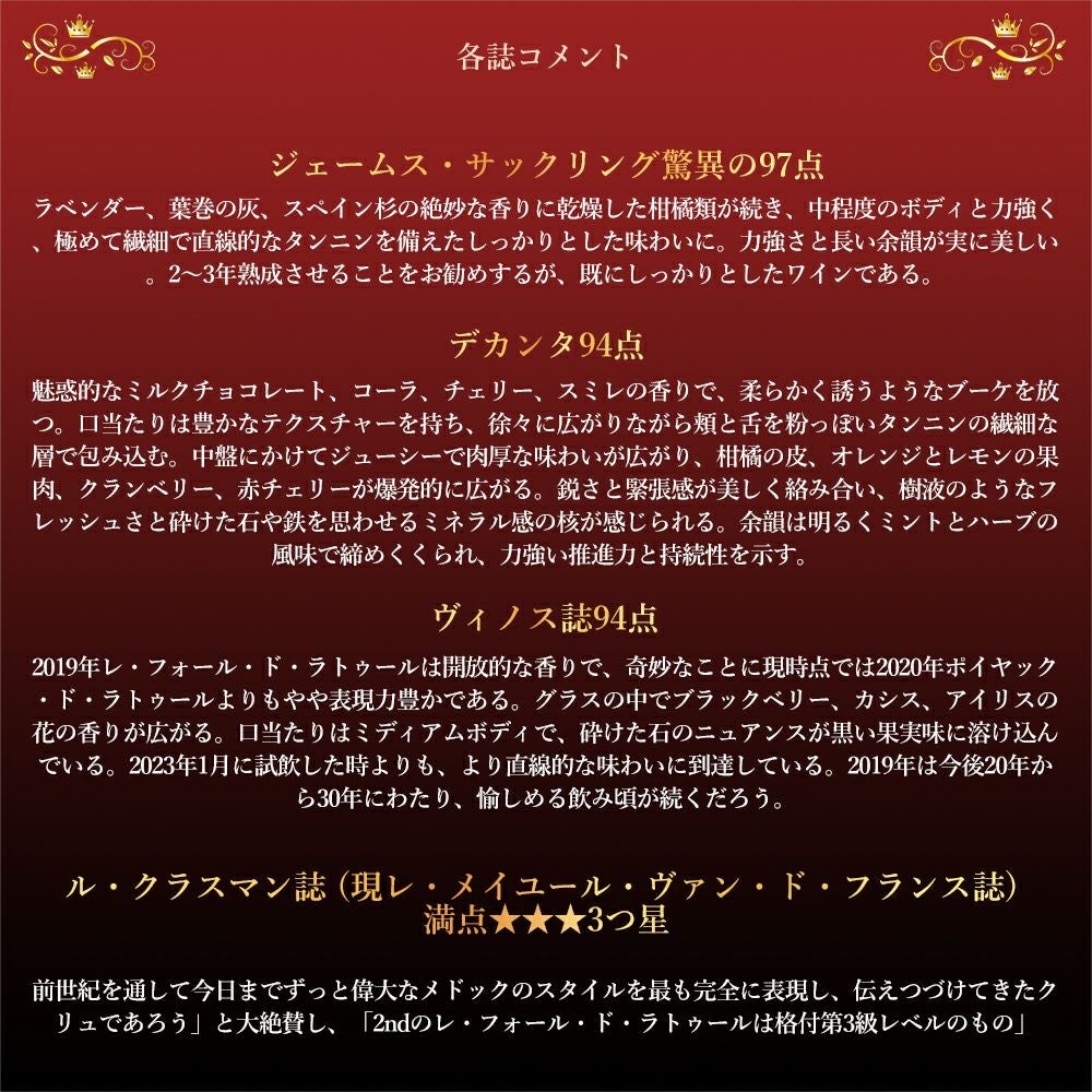 他の画像を見る レ フォール ド ラトゥール 2019 メドック プルミエ クリュ クラッセ 公式格付第一級 AOCポイヤック シャトー ラトゥールのセカンドラベル ジェームス サックリング驚異の97点Les Forts de Latour 2019 赤ワイン フランス 辛口 当店特別価格 ¥ 41,779 税込 カートに入れる お気に入りに登録する