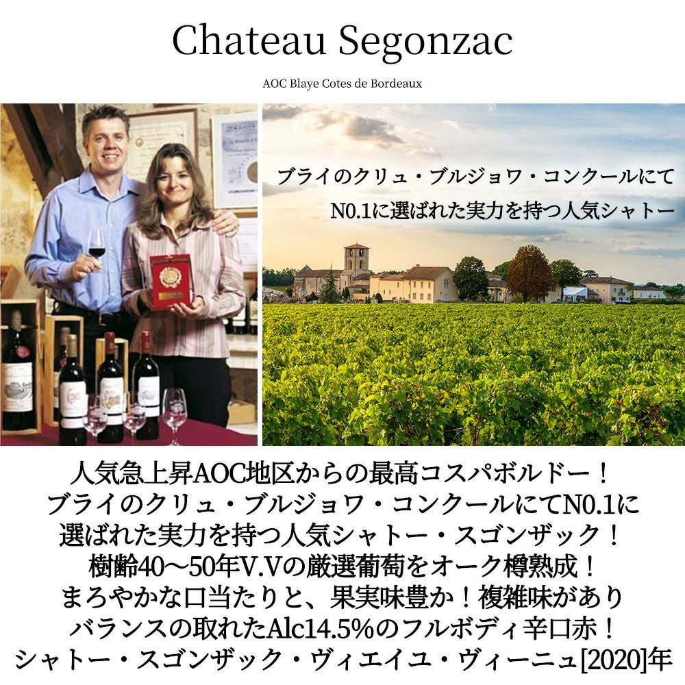 他の画像を見る シャトー スゴンザック ヴィエイユ ヴィーニュ 2020 オーク樽12ヶ月熟成 AOCブライ コート ド ボルドー 赤 辛口 フルボディ 750mlChateau Segonzac Vieilles Vignes 2020 赤ワイン フランス フルボディ 辛口 当店特別価格 ¥ 2,246 税込 カートに入れる お気に入りに登録する
