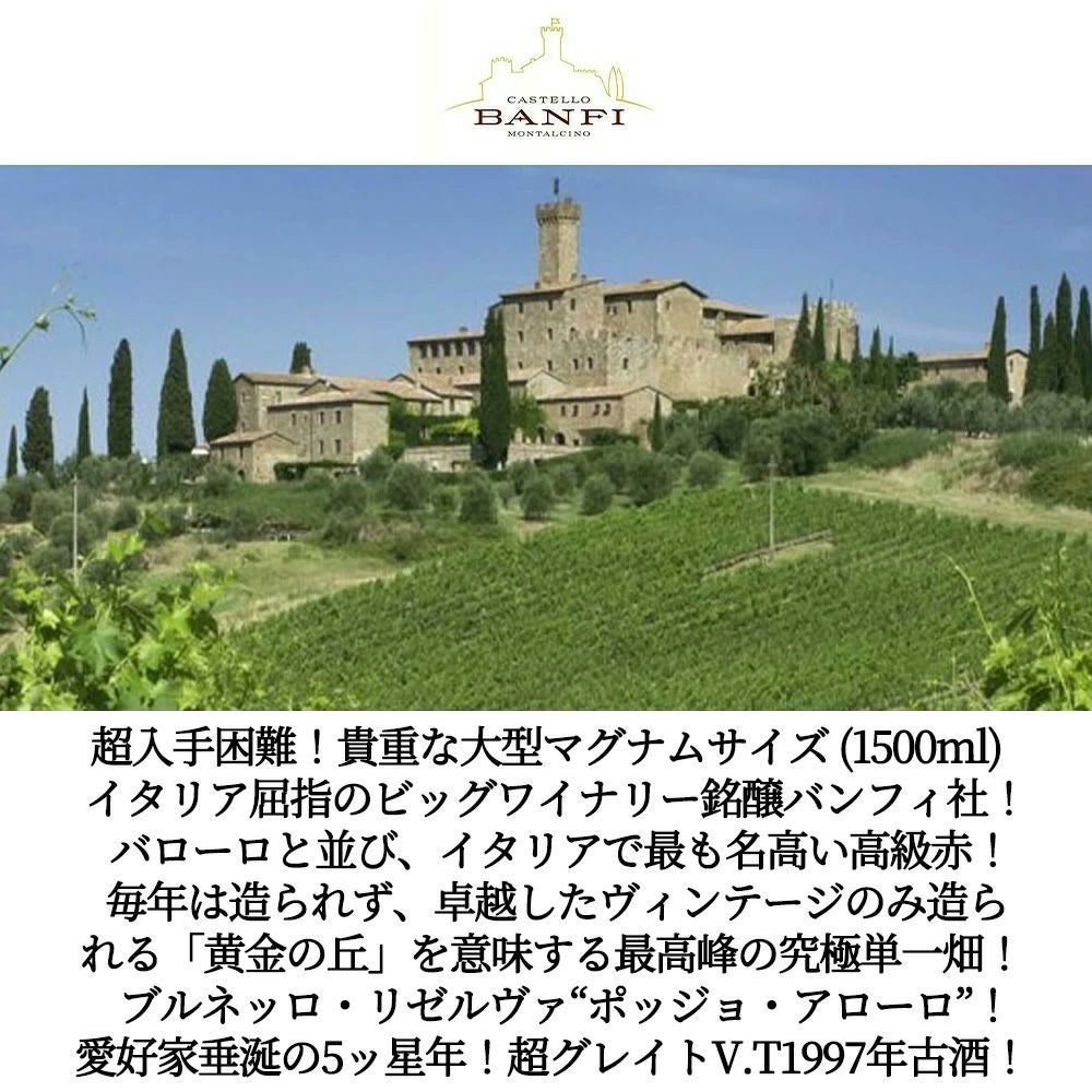他の画像を見る 【大型ボトル 木箱入り】ブルネッロ ディ モンタルチーノ リゼルヴァ ポッジョ アローロ 1997 カステッロ バンフィ元詰 正規代理店輸入品 1500mlBrunello di Montalcino Riserva Poggio ALL'ORO 赤ワイン イタリア フルボディ 辛口 当店特別価格 ¥ 93,841 税込 カートに入れる お気に入りに登録する