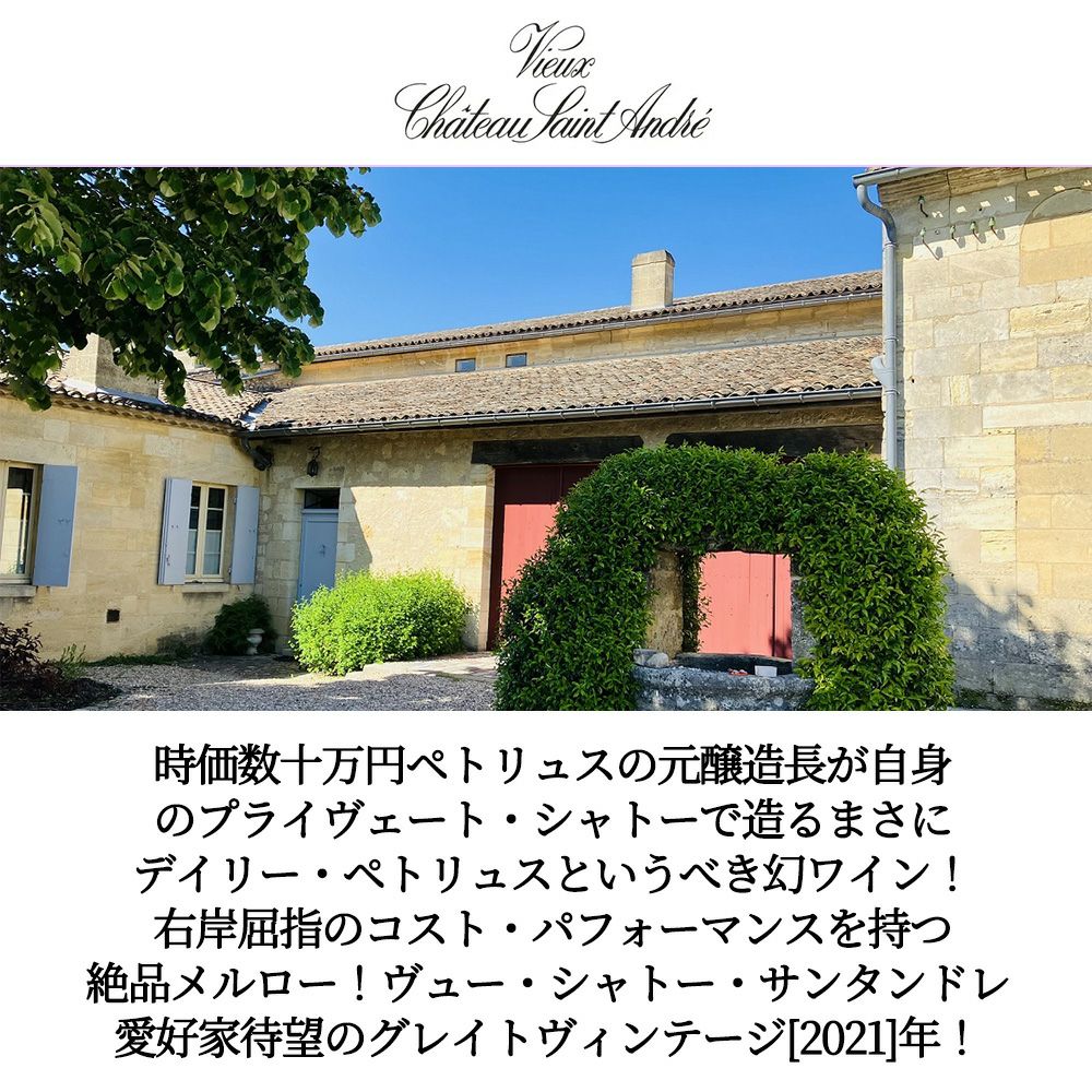 他の画像を見る ヴュー シャトー サンタンドレ 2021 シャトー元詰 AOCモンターニュ サンテミリオンVieux Chateau Saint Andre 2021 AOC Montagne St-Emilion 赤ワイン フランス フルボディ 辛口 当店特別価格 ¥ 3,845 税込 カートに入れる お気に入りに登録する