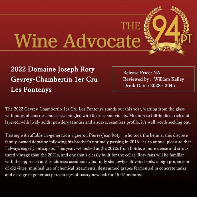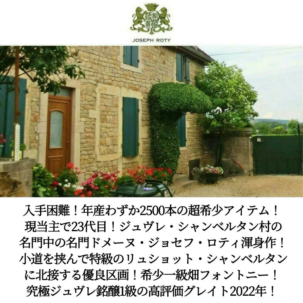 他の画像を見る ジュヴレ シャンベルタン プルミエ クリュ レ フォントニ 2022 蔵出し限定品 ドメーヌ ジョセフ ロティ家元詰 正規品Gevrey Chambertin 1er Les Fontenys 2022 Domaine Joseph Roty 赤ワイン フランス フルボディ 辛口 当店特別価格 ¥ 32,374 税込 カートに入れる お気に入りに登録する