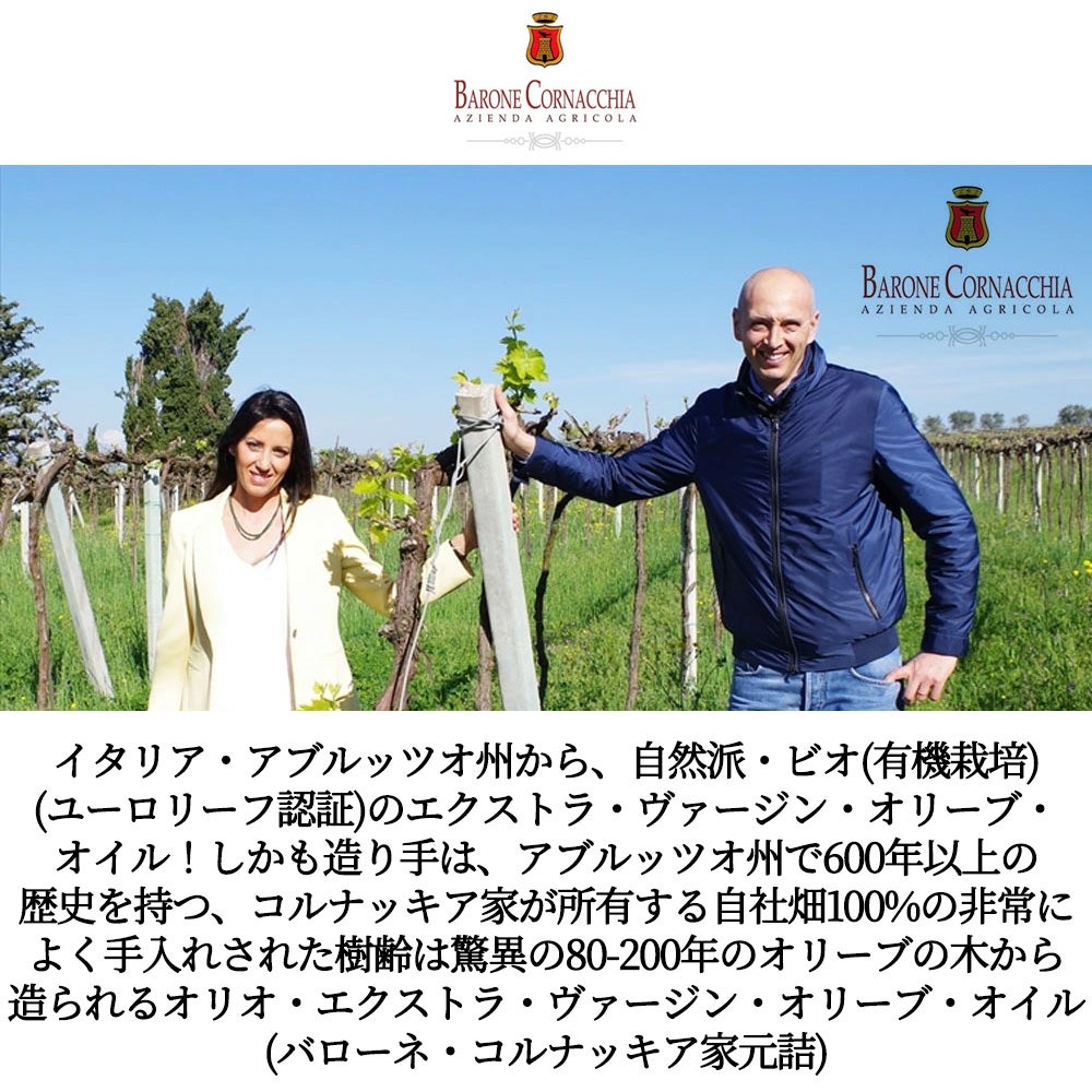 他の画像を見る バローネ コルナッキア オリオ エクストラ ヴァージン オリーブ オイル (バローネ コルナッキア家元詰) 自然派 500mlOLIO EXTRA VERGINE DI OLIVA Ag. Agr. Barone Cornacchia BIO イタリア 自然派 当店特別価格 ¥ 3,283 税込 カートに入れる お気に入りに登録する