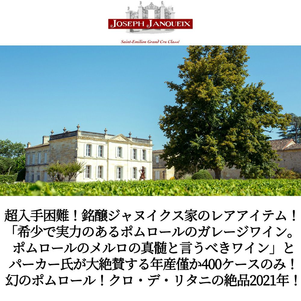 他の画像を見る クロ デ リタニ 2021 年 AOCポムロール ジャヌイクス家元詰 メルロー100% ノンフィルター CLOS DES LITANIES 2021 AOC Pomerol (Famille Joseph Janoueix) 赤ワイン フランス フルボディ 辛口 当店特別価格 ¥ 8,360 税込 カートに入れる お気に入りに登録する