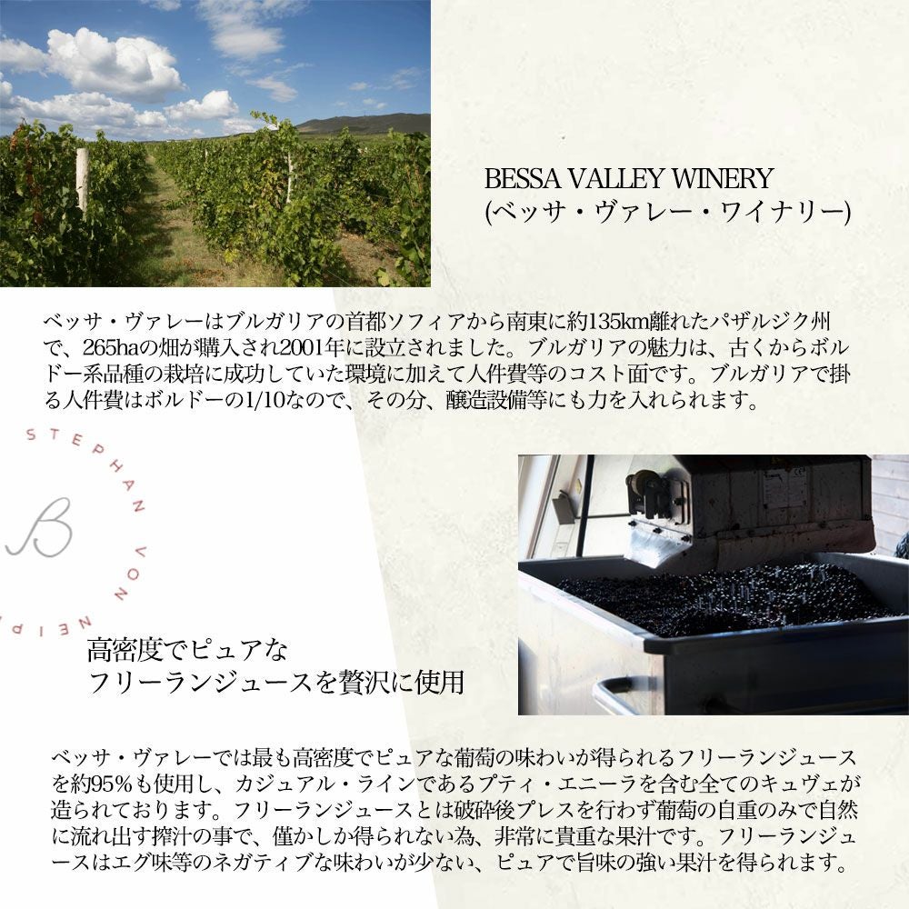 他の画像を見る 【ロゴ入り大型グラス付特別セット】エニーラ レゼルヴァ 2016 ドメーヌ ベッサ ヴァレー ワイナリー元詰 ブルガリア パザルジク州 ENIRA RESERVA 2016 P.G.I. THARACIAN LOWLANDS&a Glass Set 赤ワイン フルボディ 辛口 当店特別価格 ¥ 4,350 税込 カートに入れる お気に入りに登録する