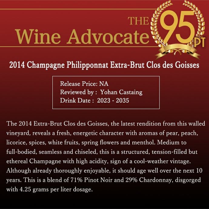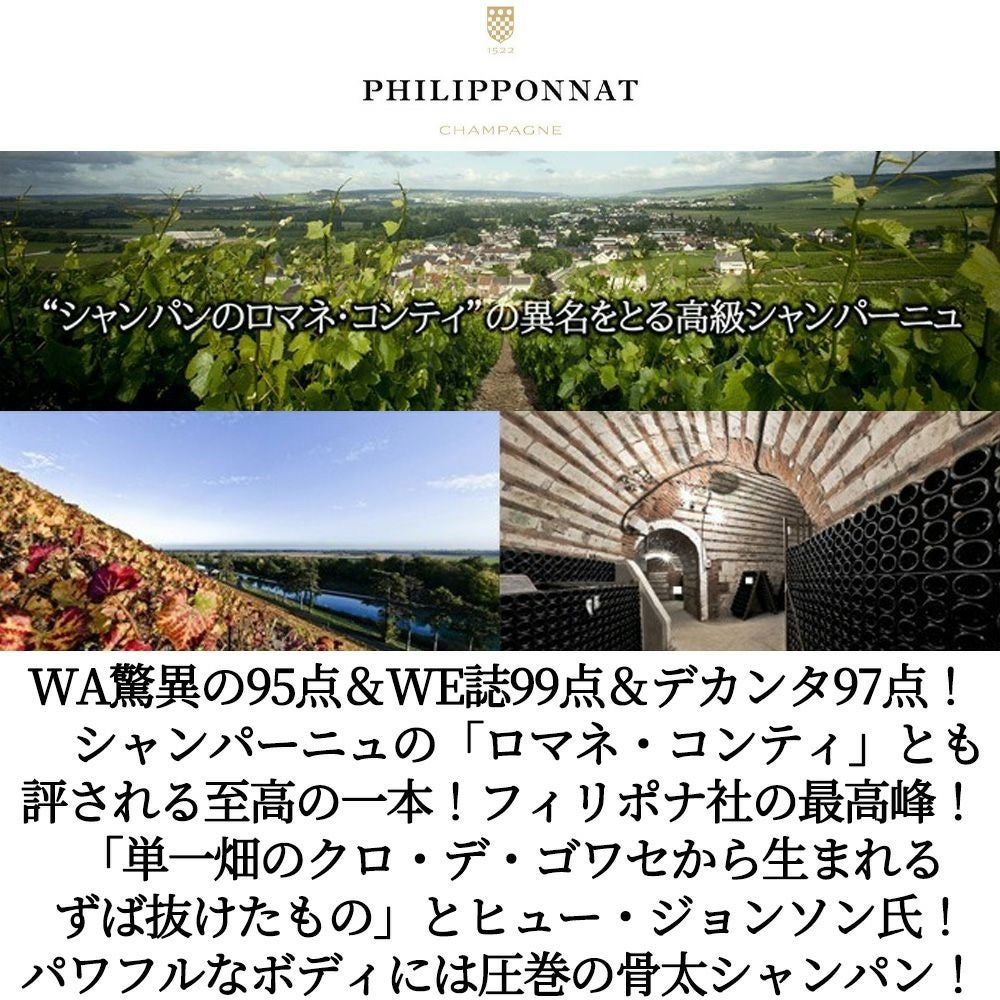 他の画像を見る 【豪華箱入】フィリポナ シャンパーニュ クロ デ ゴワセ (モノポール) ミレジム 2014 フィリポナ社 AOCヴィンテージ 正規代理店輸入品Philipponnat Champagne CLOS des Goisses (Monopole) 白ワイン シャンパン フランス 辛口 当店特別価格 ¥ 57,266 税込 カートに入れる お気に入りに登録する