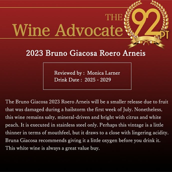 他の画像を見る ロエロ アルネイス 2023 ブルーノ ジャコーザ元詰 DOCGロエロ アルネイス 正規品 WA誌驚異92点&JS93点 白 辛口 イタリアRoero ARNEIS 2023 Bruno Giacosa DOCG Roero ARNEIS 白ワイン イタリア 辛口 当店特別価格 ¥ 5,935 税込 カートに入れる お気に入りに登録する