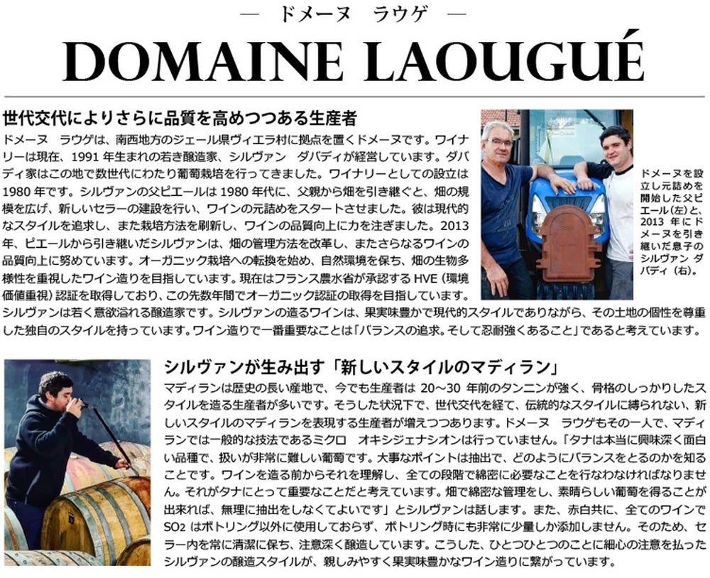 他の画像を見る ヴァン ド フランス タナ フュ ド シェーヌ 2024 蔵出し品 ドメーヌ ラウゲ元詰 タナ種100% 樽熟成 赤 辛口 フルボディVin de France Tanat's Futs de Chene 2024 Domaine 赤ワイン フランス フルボディ 辛口 当店特別価格 ¥ 2,340 税込 カートに入れる お気に入りに登録する