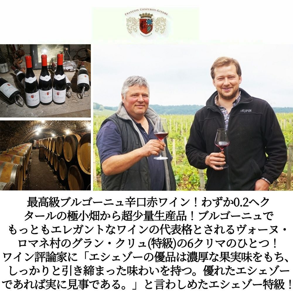 他の画像を見る エシェゾー グラン クリュ 特級 2023 蔵出し限定品 ドメーヌ フランソワ コンフュロン ジャンドル元詰 日本入荷わずか48本のみ AOCEchezeaux Grand Cru 2023 Domaine Francois Confuron 赤ワイン フランス フルボディ 辛口 当店特別価格 ¥ 37,979 税込 カートに入れる お気に入りに登録する