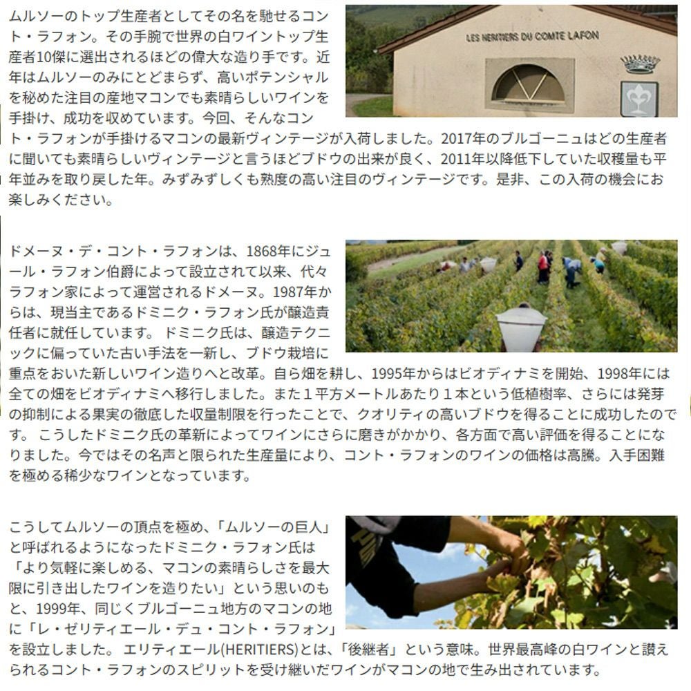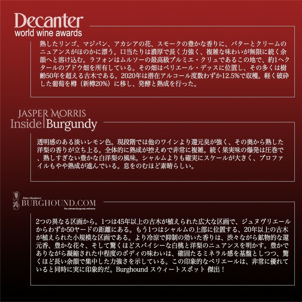 他の画像を見る ムルソー プルミエ クリュ 一級 ペリエール 2020 蔵出し品 ドメーヌ デ コント ラフォン元詰 AOCムルソー 自然派Meursault 1er Cru Perrieres 2020 Domaine des Comtes Lafon AOC Meursault 1er Cru 白ワイン フランス 辛口 当店特別価格 ¥ 166,991 税込 カートに入れる お気に入りに登録する