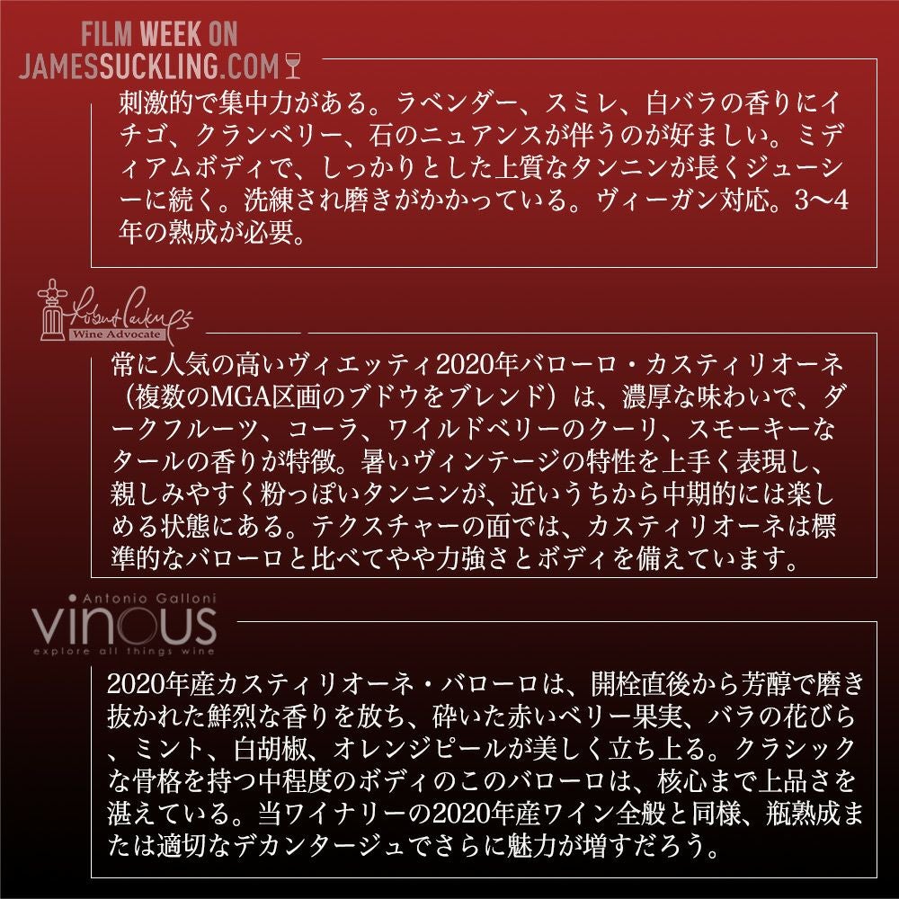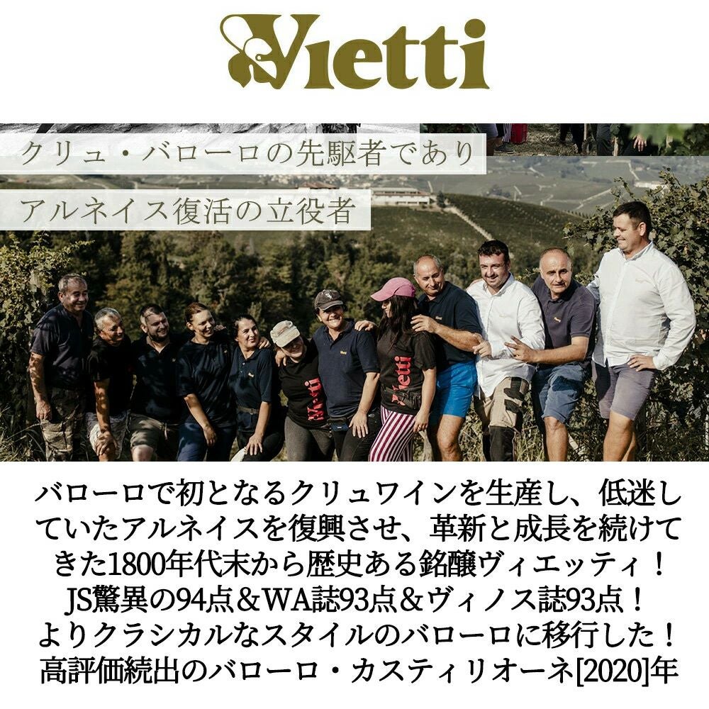 他の画像を見る バローロ カスティリオーネ 2020 ヴィエッティ DOCGバローロ 大樽&バリック樽で約30ヶ月熟成 Barolo Castiglione 2020 Vietti DOCG Barolo 赤ワイン イタリア フルボディ 辛口 当店特別価格 ¥ 9,969 税込 カートに入れる お気に入りに登録する