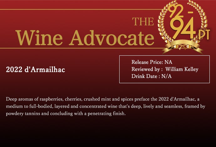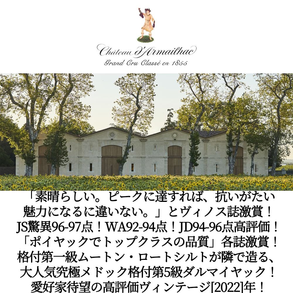 他の画像を見る シャトー ダルマイヤック 2022 メドック グラン クリュ クラッセ 格付第5級 AOCポイヤック ジェームス サックリング驚異の96-97点Chateau d'Armailhac 2022 AOC Pauillac 赤ワイン フランス フルボディ 辛口 当店特別価格 ¥ 10,324 税込 カートに入れる お気に入りに登録する