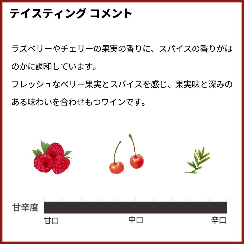 輝きのある深紅色。ラズベリーやチェリーの果実の香りに、スパイスの香りがほのかに調和しています。フレッシュなベリー果実とスパイスを感じ、果実味と深みのある味わいを合わせもつワインです。