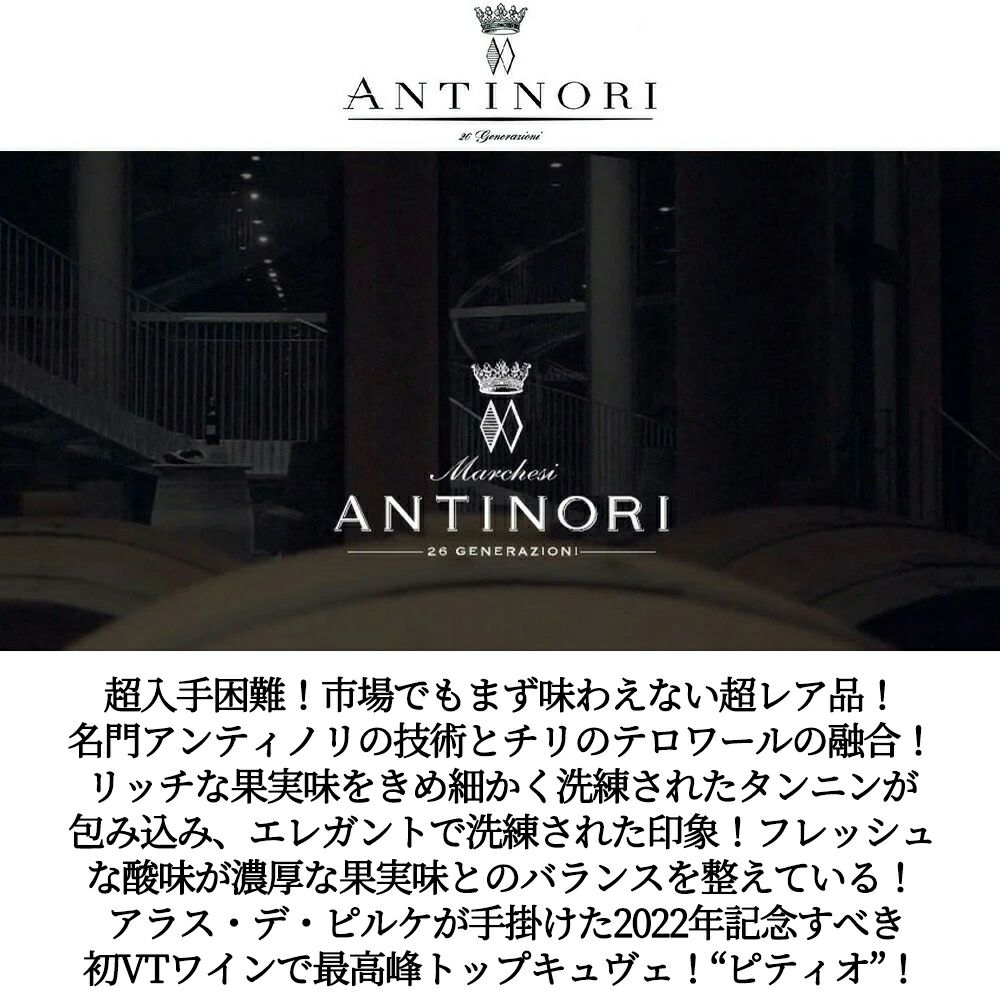 他の画像を見る 【豪華木箱入】ピティオ 2022 年 アラス デ ピルケ (イタリアの名門アンティノリ家) チリ マイポ ヴァレー 記念すべき初ヴィンテージワインPITIO 2022 Haras de Pirque Chile Maipo Valley 赤ワイン チリ フルボディ 辛口 当店特別価格 ¥ 28,006 税込 カートに入れる お気に入りに登録する