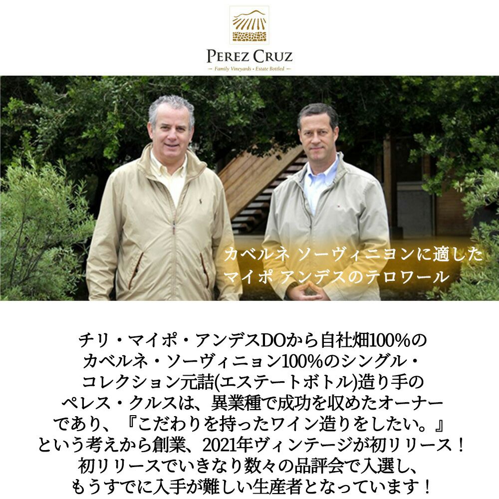 他の画像を見る ピルカス カベルネ ソーヴィニヨン 2021 ヴィーニャ ペレス クルス元詰 DO マイポ アンデス フレンチオーク樽100%で14ヶ月熟成 赤 辛口Pircas Cabernet Sauvignon 2021 Perez Cruz Pircas 赤ワイン チリ フルボディ 辛口 当店特別価格 ¥ 5,585 税込 カートに入れる お気に入りに登録する