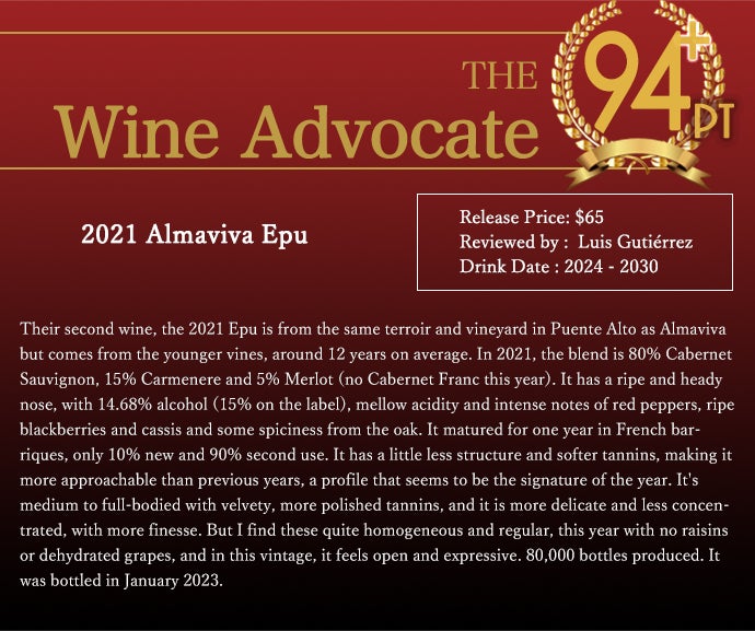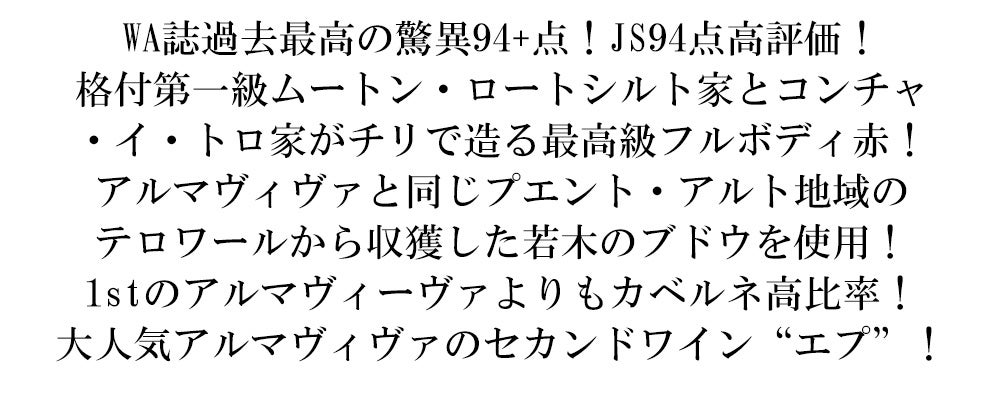 他の画像を見る エプ アルマヴィーヴァ 2021 バロン フィリップ ド ロートシルト ムートン ロートシルト & コンチャ イ トロ元詰 赤 辛口 フルボディEpu (Almaviva Puente Alto) 2021 Vina Almaviva 赤ワイン チリ フルボディ 辛口 当店特別価格 ¥ 8,339 税込 在庫切れ 詳細を見る お気に入りに登録する