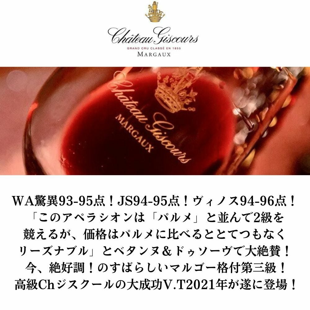 他の画像を見る シャトー ジスクール 2021 メドック グラン クリュ クラッセ 格付第三級 AOCマルゴー オーク樽15-18ヶ月熟成 ヴィノス誌94-96点Chateau Giscours 2021 Grand Cru Classe 赤ワイン フランス フルボディ 辛口 当店特別価格 ¥ 9,384 税込 在庫切れ 詳細を見る お気に入りに登録する