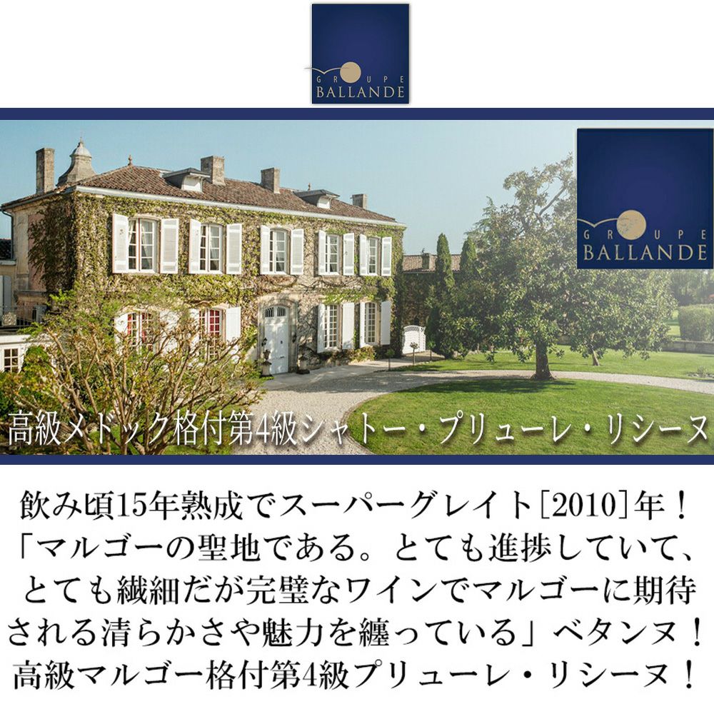 他の画像を見る シャトー プリューレ リシーヌ 2010 AOCマルゴー (メドック グラン クリュ クラッセ メドック格付第4級) (バランド家) 赤 辛口Chateau Prieure Lichine 2010 AOC Margaux 赤ワイン フランス フルボディ 辛口 当店特別価格 ¥ 15,466 税込 在庫切れ 詳細を見る お気に入りに登録する