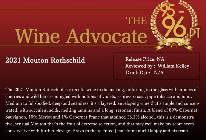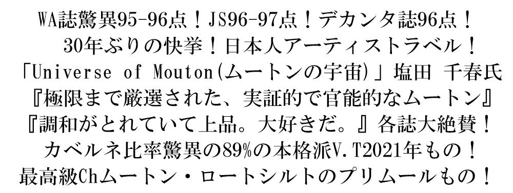 他の画像を見る シャトー ムートン ロートシルト 2021 AOCポイヤック メドック プルミエ グラン クリュ クラッセ 公式格付第一級 赤 辛口 フランスChateau Mouton Rothschild [2021] AOC Pauillac 赤ワイン フランス フルボディ ミディアムボディ 辛口 当店特別価格 ¥ 102,201 税込 カートに入れる お気に入りに登録する
