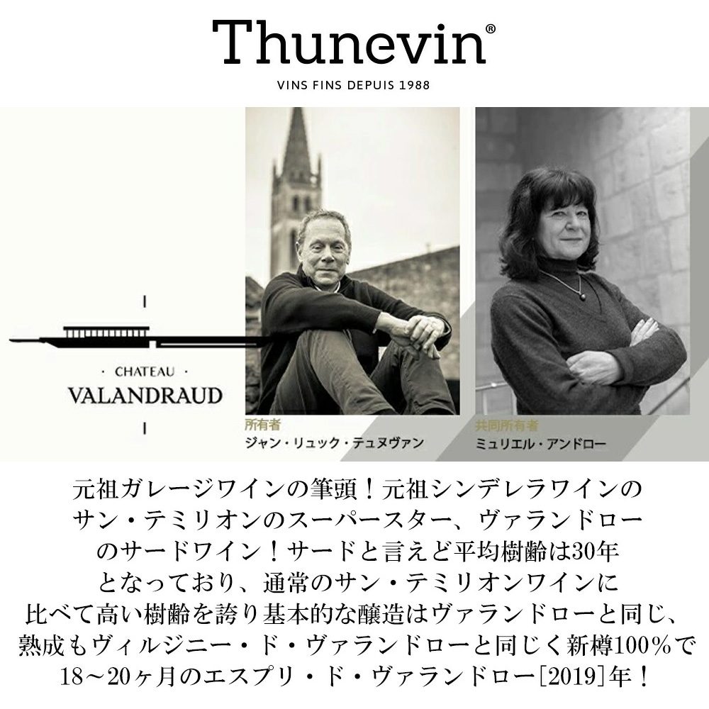 シャトー・ド・ヴァランドロー・エスプリ・ド・ヴァランドロー[2019]年・AOCサンテミリオン・グラン・クリュ・特級(2012年新格付けでなんとプルミエ・グラン・クリュ・クラッセに2階級昇格のシャトー・ド・ヴァランドローのサードラベル)・シャトー元詰・(ジャン・リュック・テュヌヴァン)・14%