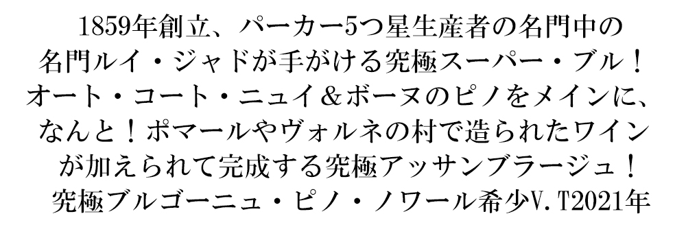 大人気ブルゴーニュ辛口赤ワイン愛好家代注目!メゾン・ルイ・ジャド社の手による究極スーパーAOCブルゴーニュ・ピノ・ノワール!しかも愛好家待望の少量生産ながら大人気グレイトヴィンテージ[2023]年 (アシェット・ガイド誌2026年版でもブルゴーニュの赤に17/20点&RVF誌2026年版で驚異の95点の偉大な年)でついに少量入荷!このピノ・ノワールは、オート・コート・ド・ニュイとオート・コート・ド・ボーヌのピノ・ノワールをメインに、なんと!ポマールやヴォルネィ、さらにコート・ド・ニュイの村で造られたワインが加えられて完成する、まさに究極とも言えるアッサンブラージュのもと造りだされるスーパーAOCブルゴーニュ!ニュイの深みのあるタンニンと、ボーヌのポマールやヴォルネイなどの凝縮された果実味を持つ、ブルゴーニュ・ピノ・ノワール種の個性を非常に良くあらわした人気辛口赤ワイン!最低7-8年の熟成・保存が楽しめる、本格派辛口赤ワインが正規代理店輸入品で限定で少量入荷!